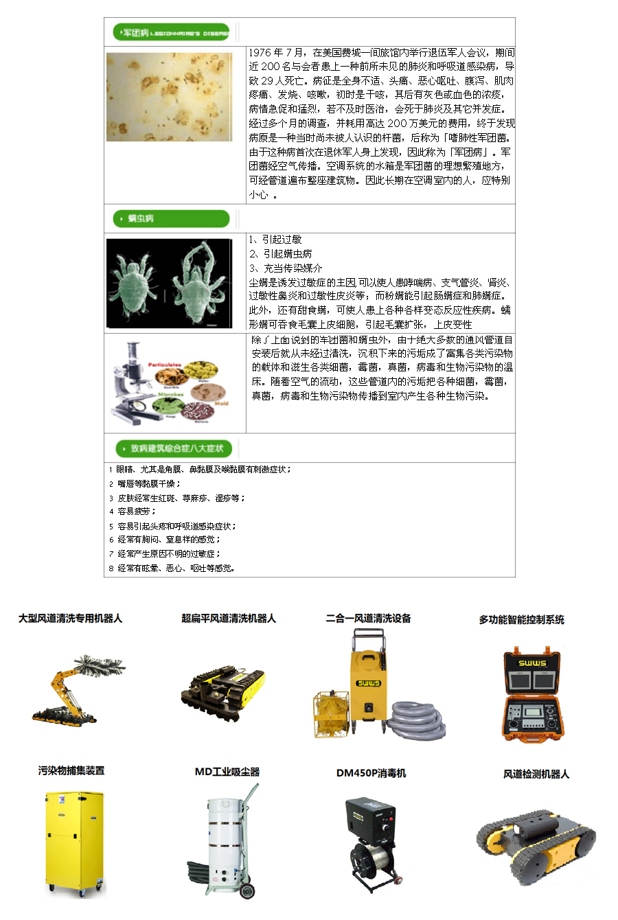 如今空調(diào)已經(jīng)成為許多大型建筑不可或缺的一部分,然而,在給人們帶來(lái)舒適室內(nèi)環(huán)境,由于長(zhǎng)期得不到清洗維護(hù),空調(diào)系統(tǒng)成為病菌滋生的溫床,尤其風(fēng)管內(nèi)一年四季溫濕度較為適宜動(dòng)物和昆蟲寄生,如老鼠、蟑螂等。長(zhǎng)期得不到清洗維護(hù)的空調(diào)通風(fēng)系統(tǒng)成為病菌滋生的溫床,生活在被污染的空氣中,輕則引發(fā)惡心、干咳、皮膚過(guò)敏、人體疲勞,重則可能引發(fā)呼吸道傳染病,如軍團(tuán)病、SARS 病毒等;同時(shí)風(fēng)管中大量堆積灰塵垃圾,會(huì)導(dǎo)致風(fēng)阻加大、機(jī)組運(yùn)轉(zhuǎn)能力下降,增加了能源損耗,設(shè)備使用壽命也會(huì)受到影響。 隨著非典的影響,越來(lái)越多的人意識(shí)到空調(diào)風(fēng)管是傳播的重要途徑,健康意識(shí)有所加強(qiáng),對(duì)風(fēng)管清洗的認(rèn)識(shí)大大提高,市場(chǎng)需求逐漸啟動(dòng)。在國(guó)內(nèi)由于缺乏專業(yè)的空調(diào)風(fēng)管清洗技術(shù)和設(shè)備,大多數(shù)地區(qū)的空調(diào)長(zhǎng)期運(yùn)行卻沒清洗過(guò)。