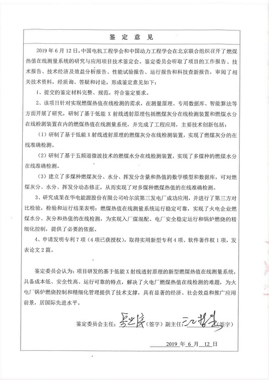 2019年6月12日,中國(guó)電機(jī)工程學(xué)會(huì)和中國(guó)動(dòng)力工程學(xué)會(huì)在北京聯(lián)合組織召開(kāi)了燃煤熱值在線(xiàn)測(cè)量系統(tǒng)的研究與應(yīng)用項(xiàng)目技術(shù)鑒定會(huì)。